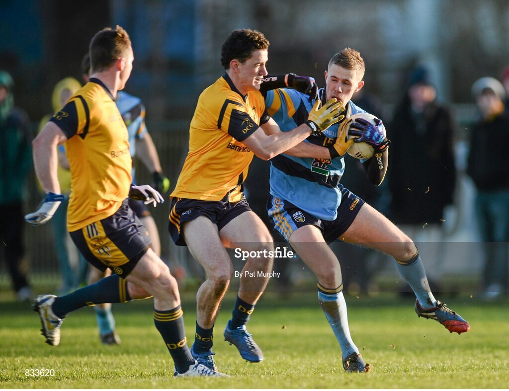 13 February 2014; Paul Mannion, University College Dublin, in action against Ciaran Cafferty and Michael Quinn, left, Dublin City University. Irish Daily Mail HE GAA Sigerson Cup 2014, Quarter-Final, University College Dublin v Dublin City University, UCD, Belfield, Dublin. Picture credit: Pat Murphy / SPORTSFILE