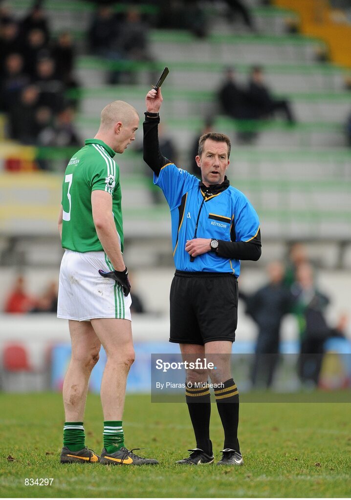 16 February 2014; Kevin Reilly, Leinster, is shown the black card by referee Eamon O'Grady after a foul on Michael Murphy, Ulster. M Donnelly Interprovincial Football Championship, Semi-Final, Leinster v Ulster, Páirc Táilteann, Navan, Co. Meath. Picture credit: Piaras Ó Mídheach / SPORTSFILE
