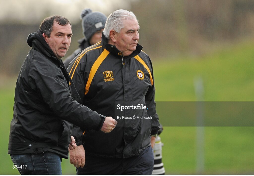 16 February 2014; Ulster manager Joe Kernan, right, and selector Seamus McEnaney celebrate at the final whistle. M Donnelly Interprovincial Football Championship, Semi-Final, Leinster v Ulster, Páirc Táilteann, Navan, Co. Meath. Picture credit: Piaras Ó Mídheach / SPORTSFILE