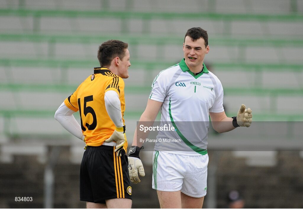 16 February 2014; Conor McManus, Ulster, left, and Paddy O'Rourke, Leinster, in conversation during the game. M Donnelly Interprovincial Football Championship, Semi-Final, Leinster v Ulster, Páirc Táilteann, Navan, Co. Meath. Picture credit: Piaras Ó Mídheach / SPORTSFILE