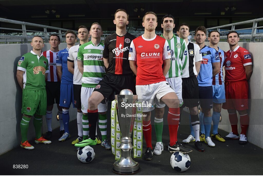 28 February 2014; SSE Airtricity League Premier Division players left to right, Liam Kearney, Cork City, Clifford Byrne, Derry City, Mick Leahy, Limerick FC, Andy Boyle, Dundalk FC, Conor Kenna, Shamrock Rovers, Aidan Price, Bohemian FC, Ger O'Brien, St.Patrick Athletic, Danny O'Connor, Bray Wanderers, Aidan Collins, Athlone Town, Mark Langtry, UCD, Daire Doyle, Drogheda United, and Gavin Peers, Sligo Rovers, in attendance at the 2014 SSE Airtricity League Launch. Aviva Stadium, Lansdowne Road, Dublin. Picture credit: David Maher / SPORTSFILE