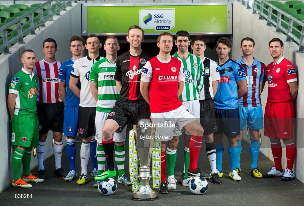 28 February 2014; SSE Airtricity League Premier Division players left to right, Liam Kearney, Cork City, Clifford Byrne, Derry City, Mick Leahy, Limerick FC, Andy Boyle, Dundalk FC, Conor Kenna, Shamrock Rovers, Aidan Price, Bohemian FC, Ger O'Brien, St.Patrick Athletic, Danny O'Connor, Bray Wanderers, Aidan Collins, Athlone Town, Mark Langtry, UCD, Daire Doyle, Drogheda United, and Gavin Peers, Sligo Rovers, in attendance at the 2014 SSE Airtricity League Launch. Aviva Stadium, Lansdowne Road, Dublin. Picture credit: David Maher / SPORTSFILE