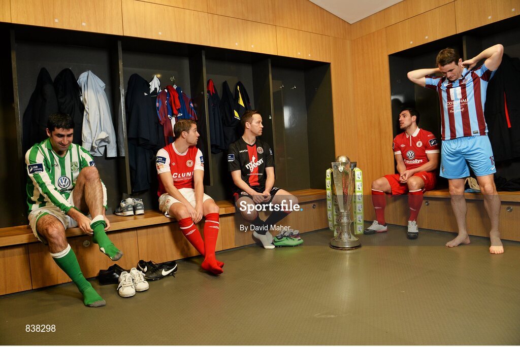 28 February 2014; SSE Airtricity Premier League players, from left, Danny O'Connor, Bray Wanderers, Ger O'Brien, St. Patrick's Athletic, Aidan Price, Bohemian FC, Gavin Peers, Sligo Rovers and Daire Doyle, Drogheda United, in attendance at the 2014 SSE Airtricity League Launch. Aviva Stadium, Lansdowne Road, Dublin. Picture credit: David Maher / SPORTSFILE