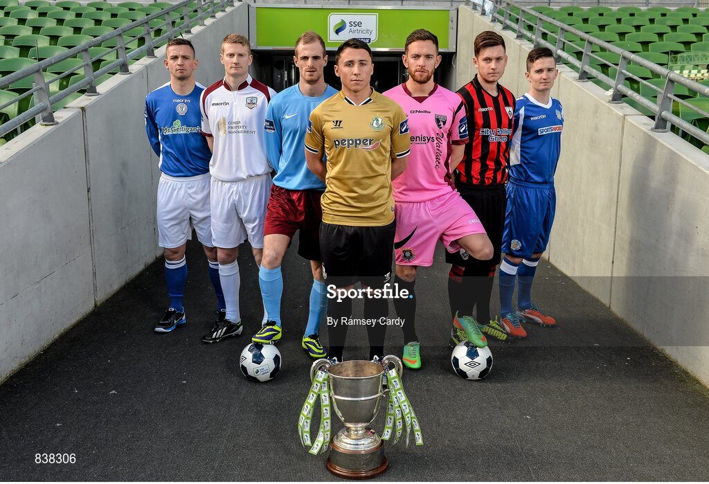 28 February 2014; SSE Airtricity League First Division players left to right, Kev McHugh, Finn Harps, Paul Synott, Galway FC, Martin Deedy, Cobh Ramblers, Chris Lyons, Shamrock Rovers, Dan Furlong, Wexford Youths, Sean Russell, Longford Town, Shane Murray, Waterford United in attendance at the 2014 SSE Airtricity League Launch. Aviva Stadium, Lansdowne Road, Dublin. Picture credit: Ramsey Cardy / SPORTSFILE