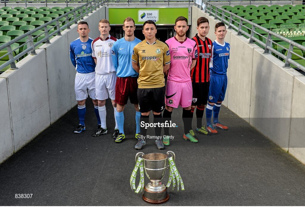28 February 2014; SSE Airtricity League First Division players left to right, Kev McHugh, Finn Harps, Paul Synott, Galway FC, Martin Deedy, Cobh Ramblers, Chris Lyons, Shamrock Rovers, Dan Furlong, Wexford Youths, Sean Russell, Longford Town, Shane Murray, Waterford United in attendance at the 2014 SSE Airtricity League Launch. Aviva Stadium, Lansdowne Road, Dublin. Picture credit: Ramsey Cardy / SPORTSFILE