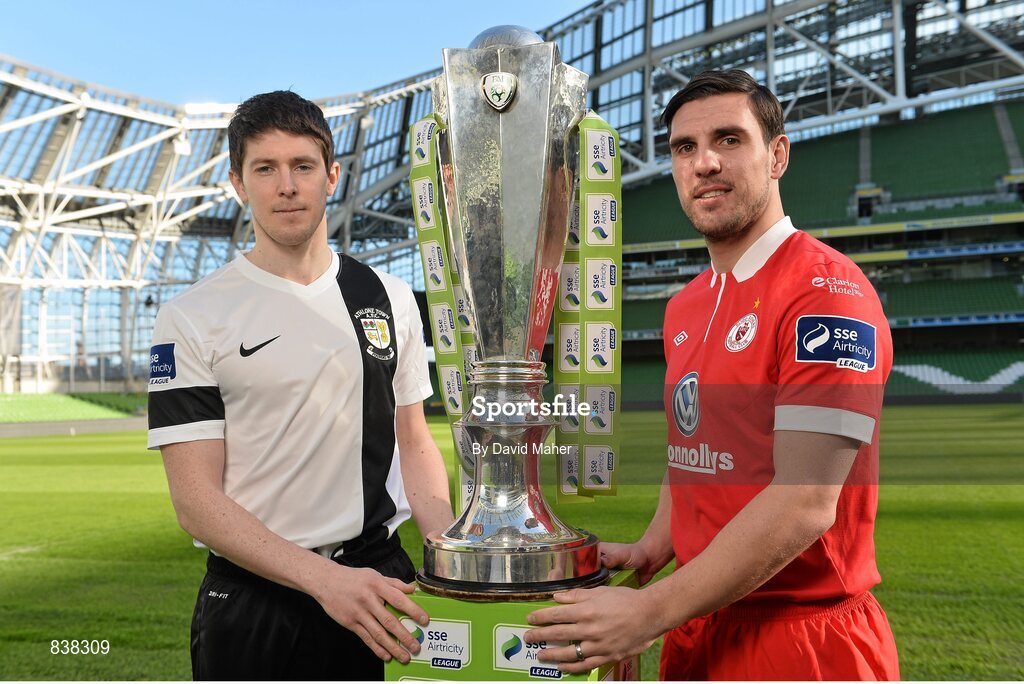 6 March 2014; Aidan Collins, Athlone Town FC, left, and Gavin Peers, Sligo Rovers, go head to head this weekend as their teams face off in the first weekends action of the 2014 SSE Airtricity League. 2014 SSE Airtricity League Launch, Aviva Stadium, Lansdowne Road, Dublin. Picture credit: David Maher / SPORTSFILE