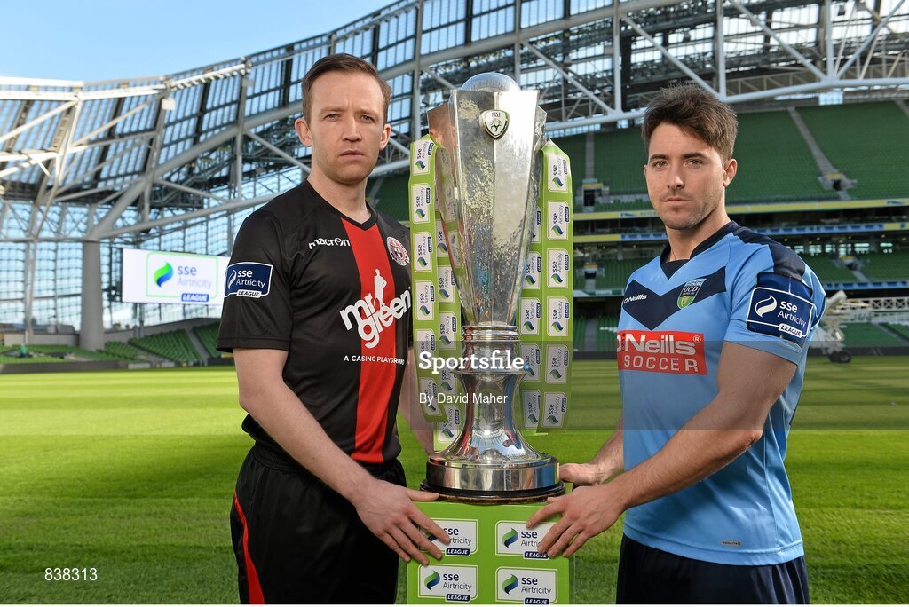 6 March 2014; Aidan Price, Bohemian FC, left, and Mark Langtry, UCD, go head to head this weekend as their teams face off in the first weekends action of the 2014 SSE Airtricity League. 2014 SSE Airtricity League Launch, Aviva Stadium, Lansdowne Road, Dublin. Picture credit: David Maher / SPORTSFILE