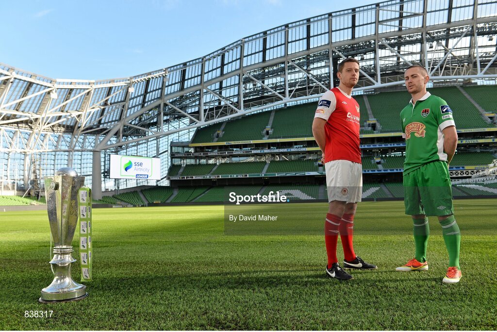 6 March 2014; Ger O'Brien, St.Patrick's Athletic, left, and Liam Kearney, Cork City, go head to head this weekend as their teams face off in the first weekends action of the 2014 SSE Airtricity League. 2014 SSE Airtricity League Launch, Aviva Stadium, Lansdowne Road, Dublin. Picture credit: David Maher / SPORTSFILE