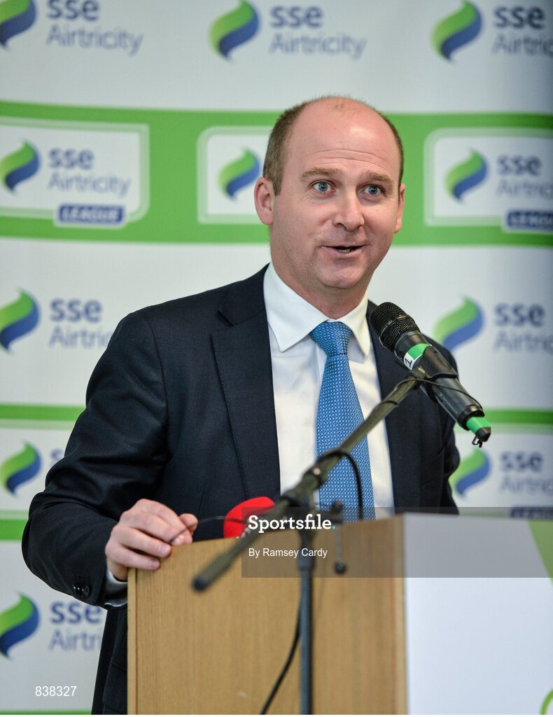 28 February 2014; Stephen Wheeler, Managing Director, SSE Airtricity, speaking during the 2014 SSE Airtricity League Launch. Aviva Stadium, Lansdowne Road, Dublin. Picture credit: Ramsey Cardy / SPORTSFILE