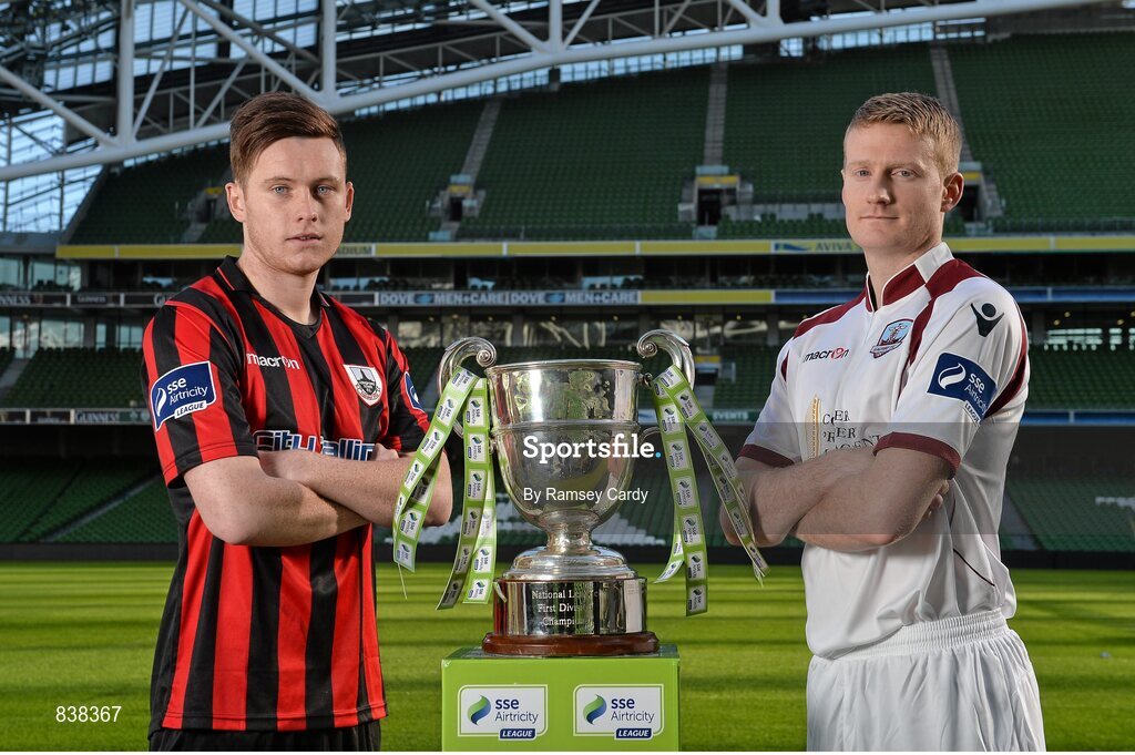 6 March 2014; Sean Russell, Longford Town, left, and Paul Synott, Galway FC, go head to head this weekend as their teams face off in the first weekends action of the 2014 SSE Airtricity League. 2014 SSE Airtricity League Launch, Aviva Stadium, Lansdowne Road, Dublin. Picture credit: Ramsey Cardy / SPORTSFILE
