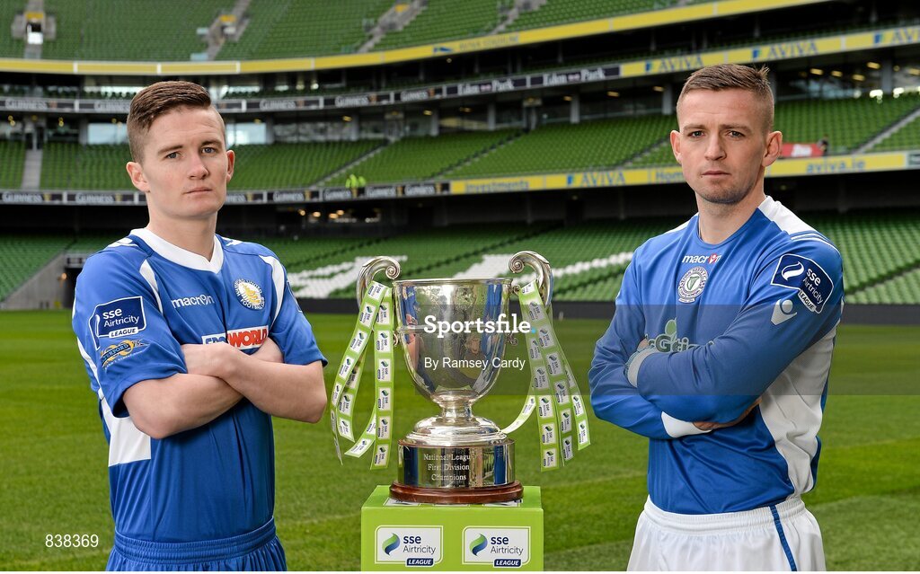 6 March 2014; Shane Murray, Waterford United, left, and Kev McHugh, Finn Harps, go head to head this weekend as their teams face off in the first weekends action of the 2014 SSE Airtricity League. 2014 SSE Airtricity League Launch, Aviva Stadium, Lansdowne Road, Dublin. Picture credit: Ramsey Cardy / SPORTSFILE