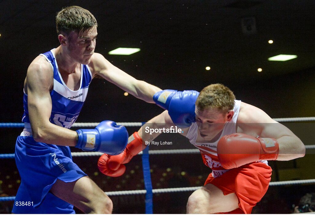 28 February 2014; Michael Nevin, Portlaoise Boxing Club, exchanges punches with Ray Moylette, St Annes Boxing Club, right, during their 64 kg bout. 2014 National Elite Boxing Championship Finals, National Stadium, Dublin. Picture credit: Ray Lohan / SPORTSFILE
