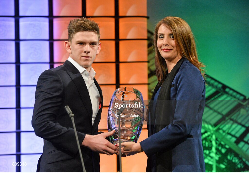 2 March 2014; Sean Murray, Watford, is presented with the U21 International player of the year award by Three Chief Commercial officer Elaine Carey, at the Three FAI International Football Awards. RTE Studios, Donnybrook, Dublin. Picture credit: David Maher / SPORTSFILE