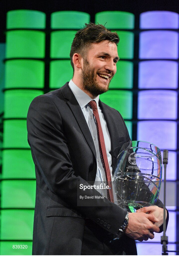 2 March 2014; Killian Brennan, St. Patrick's Athletic, winner of the Airtricity League player of the year award at the Three FAI International Football Awards. RTE Studios, Donnybrook, Dublin. Picture credit: David Maher / SPORTSFILE