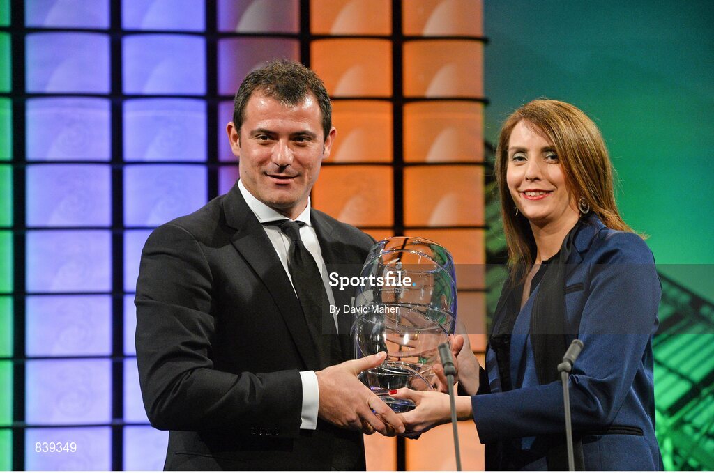 2 March 2014; International Personality of the Year award winner, Dejan Stankovic is presented with his award by Three Chief Commercial officer Elaine Carey at the Three FAI International Football Awards. RTE Studios, Donnybrook, Dublin. Picture credit: David Maher / SPORTSFILE
