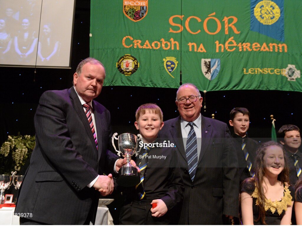 1 March 2014; Uachtarán Chumann Lúthchleas Gael Liam Ó Néill, left, and Liam Ó Laochdha, right, Cathaoirleach, Coiste Náisiúnta Scór, with Ciaran Brennan of the Na Fianna, Dublin, team of Colm Brennan, Aidan McCullagh, Cathal Brennan, and Ciaran Brennan, Aedi Caverly, Kate lynch, Caitlin Cooney, and Aisling Murphy, who won the Figure Dancing competition during the All-Ireland Scór na nÓg Championship Finals 2014. TF Royal Theatre, Castlebar, Co. Mayo. Picture credit: Pat Murphy / SPORTSFILE