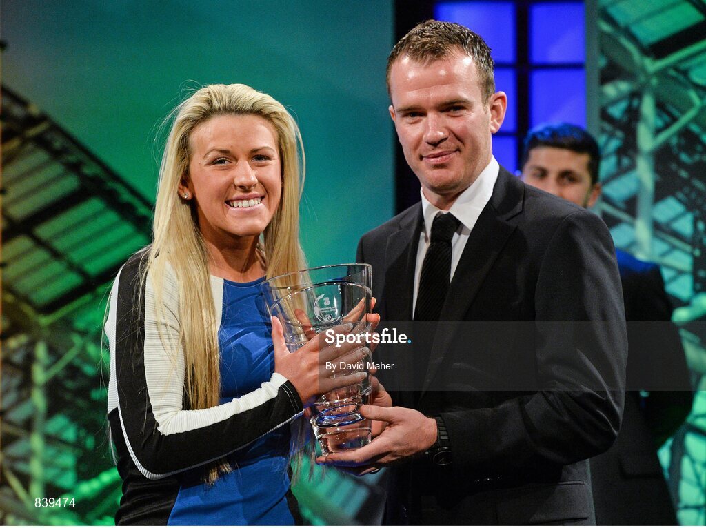 2 March 2014; Savannah McCarthy, Listowel Celtic, Co. Kerry, is presented with the U.17 Women's International player of the year award by Republic of Ireland International Glenn Whelan. Three FAI International Football Awards, RTE Studios, Donnybrook, Dublin. Picture credit: David Maher / SPORTSFILE