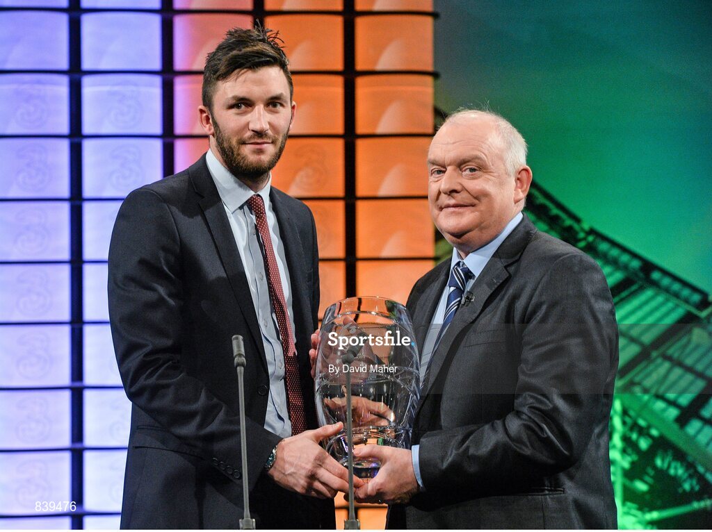 2 March 2014; Killian Brennan, St.Patrick's Athletic, is presented with the Airtricity League Player of the Year award by FAI president Paddy McCaul. Three FAI International Football Awards, RTE Studios, Donnybrook, Dublin. Picture credit: David Maher / SPORTSFILE