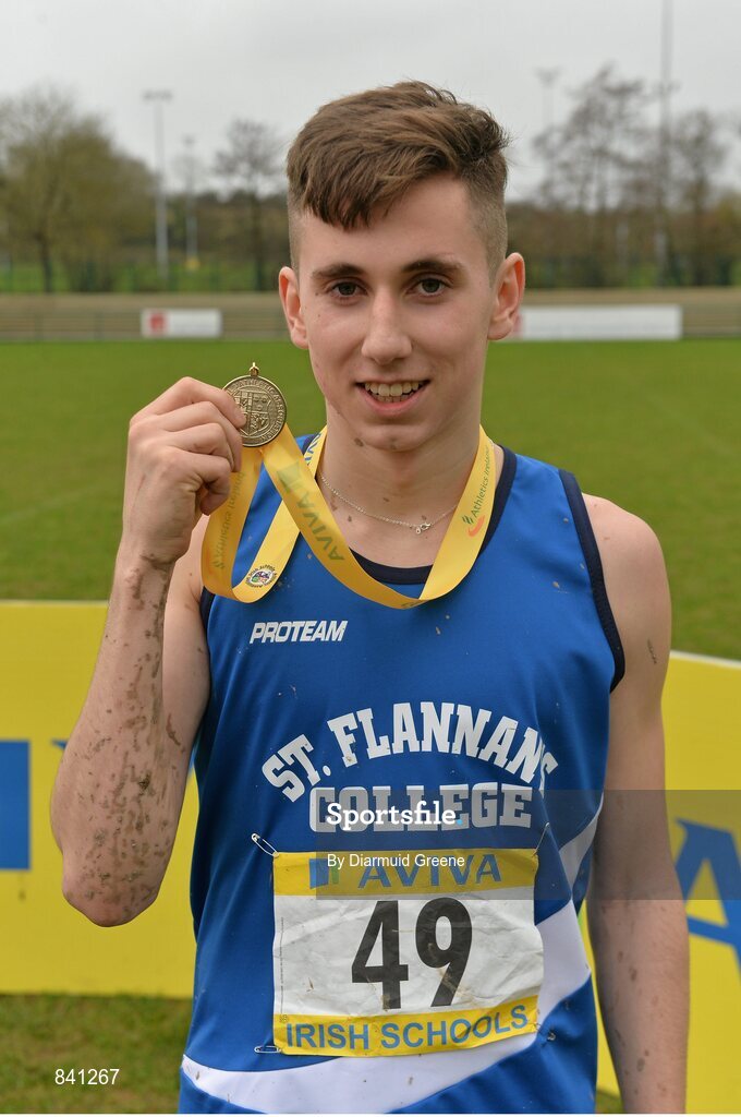 8 March 2014; Kevin Mulcaire, St. Flannan's Ennis, celebrates with his gold medal after winning the Intermediate boys 5000m race during the Aviva All-Ireland Schools Cross Country Championships. Cork IT, Bishopstown, Cork. Picture credit: Diarmuid Greene / SPORTSFILE