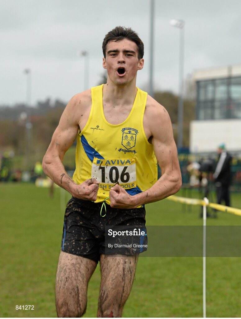 8 March 2014; Andrew Coscoran, St Mary's Drogheda, celebrates winning the Senior Boys 6500m race during the Aviva All-Ireland Schools Cross Country Championships. Cork IT, Bishopstown, Cork. Picture credit: Diarmuid Greene / SPORTSFILE