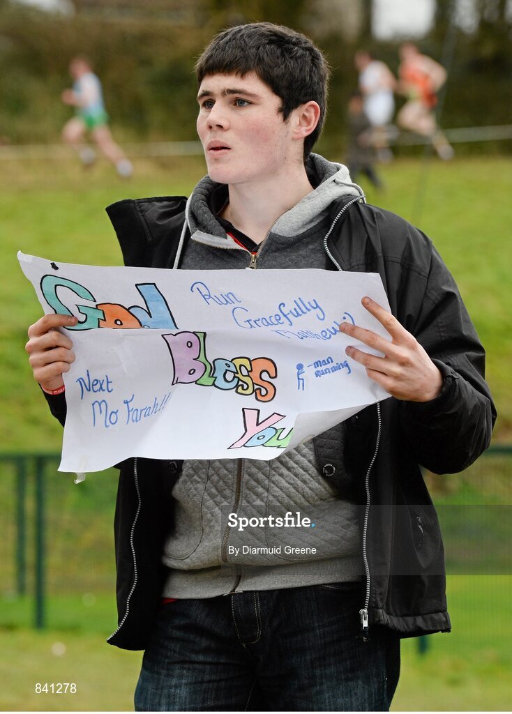8 March 2014; A spectator shows his support during the Senior Boy's 6500m race at the Aviva All-Ireland Schools Cross Country Championships. Cork IT, Bishopstown, Cork. Picture credit: Diarmuid Greene / SPORTSFILE