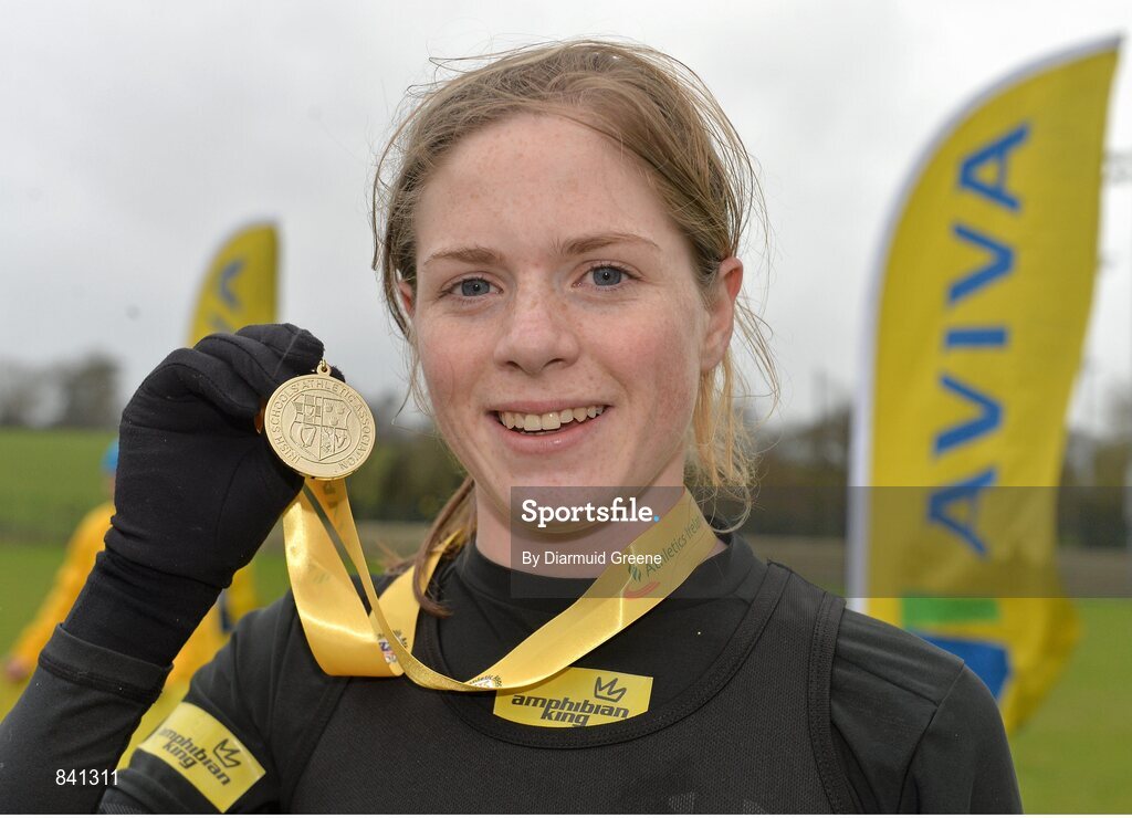 8 March 2014; Siofra Cleirigh-Buttner, Colaiste Iosagain Stillorgan, celebrates with her gold medal after winning the Senior Girl's 2500m race during the Aviva All-Ireland Schools Cross Country Championships. Cork IT, Bishopstown, Cork. Picture credit: Diarmuid Greene / SPORTSFILE