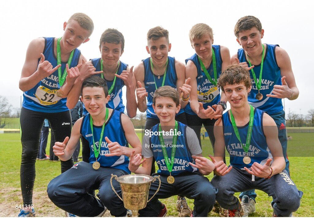 8 March 2014; The St Flannan's Ennis team celebrate after winning the team event in the Intermediate Boy's 5000m race during the Aviva All-Ireland Schools Cross Country Championships. Cork IT, Bishopstown, Cork. Picture credit: Diarmuid Greene / SPORTSFILE