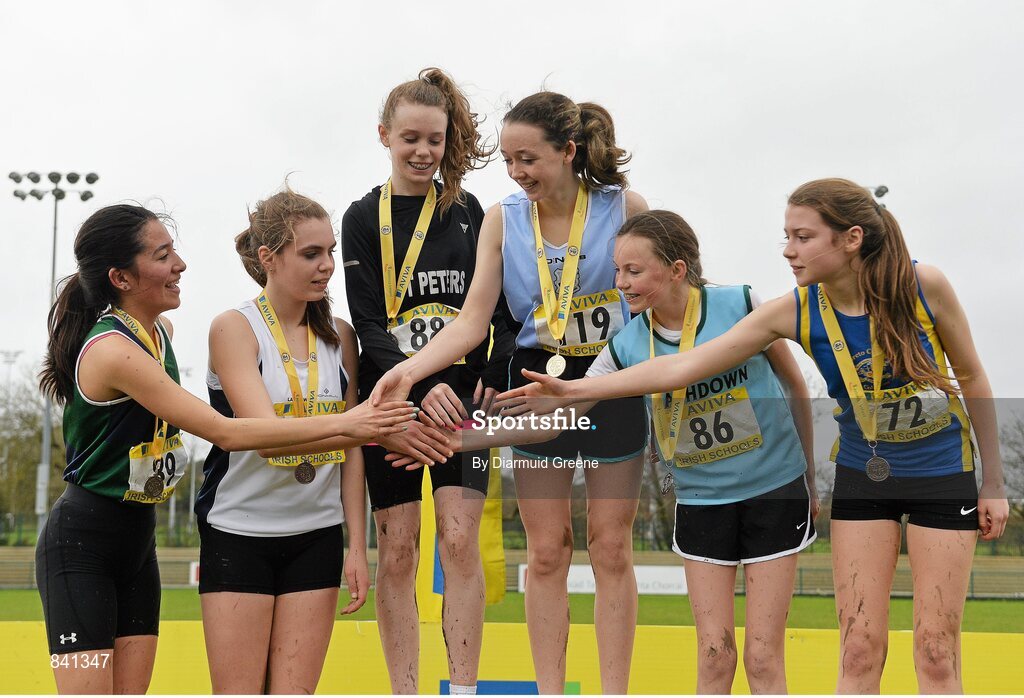 8 March 2014; The top six finishers in the Junior Girls 2000m race, from left to right, Hanna Black, East Glendalough School Wicklow, Laura Ward, Presentation College Carlow, Nicola Duffy, St Peters Dunboyne, winner Caoimhe Harrington, Colaiste Phobail Bheanntrai, Jodie McGann, Rathdown School Dublin, and Abigail McBroom, Loreto College Coleraine, exchange handshakes after the race during the Aviva All-Ireland Schools Cross Country Championships. Cork IT, Bishopstown, Cork. Picture credit: Diarmuid Greene / SPORTSFILE