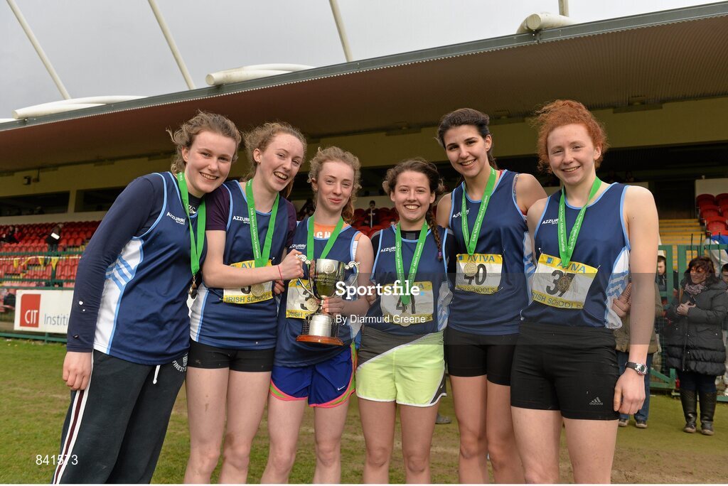 8 March 2014; Ursuline Thurles students, from left to right, Theresa Ryan, Eileen Rafter, Eimear Loughman, Sylvia O'Donnell, Orla Healy, and Ciara Cummins, after winning the team event in the Senior Girls 2500m race during the Aviva All-Ireland Schools Cross Country Championships. Cork IT, Bishopstown, Cork. Picture credit: Diarmuid Greene / SPORTSFILE
