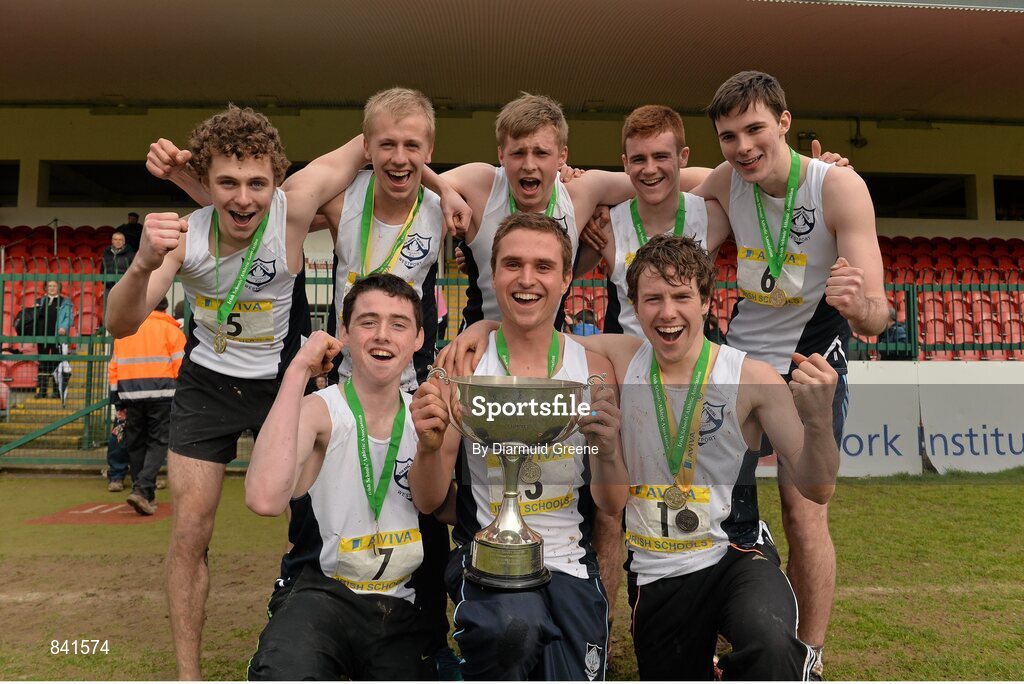 8 March 2014; Rice College Westport students, top row from left to right, Joe Hastings, David Harper, Jack Cashman, Sean Flynn, and Eoin Long, front row left to right, Diarmuid McNulty, Aichlinn O'Reilly, and Con Doherty, after winning the team event in the Senior Boys 6500m race during the Aviva All-Ireland Schools Cross Country Championships. Cork IT, Bishopstown, Cork. Picture credit: Diarmuid Greene / SPORTSFILE