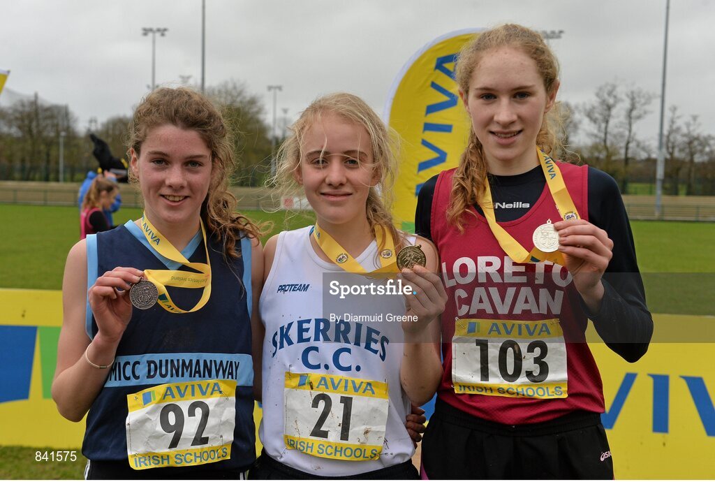 8 March 2014; From left to right, third place Fiona Everard, Maria Immaculate CC, Dunmanway, first place Rhona Peirce, Skerries CC, and second place Clodagh O'Reilly, Loreto College Cavan, after the Intermediate Girls 3500m race at the Aviva All-Ireland Schools Cross Country Championships. Cork IT, Bishopstown, Cork. Picture credit: Diarmuid Greene / SPORTSFILE