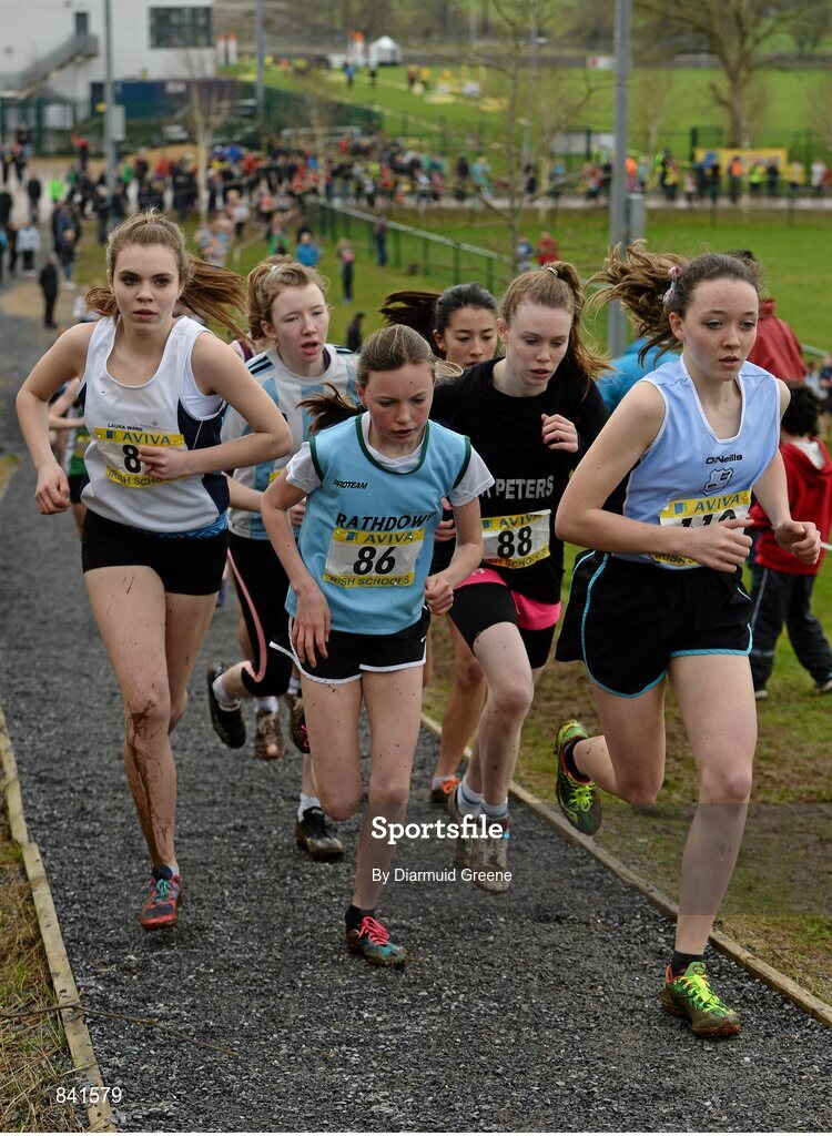 8 March 2014; Caoimhe Harrington, Colaiste Phobail Bheanntrai, right, on her way to winning the Junior Girls 2000m race from eventual second place Jodie McCann, Rathdown School Dublin, no.86, and eventual third place Nicola Duffy, St Peter's Dunboyne, no.88, during the Aviva All-Ireland Schools Cross Country Championships. Cork IT, Bishopstown, Cork. Picture credit: Diarmuid Greene / SPORTSFILE