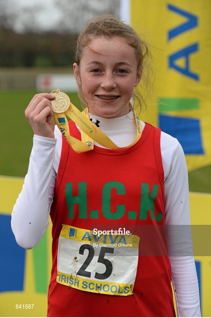 8 March 2014; Sarah Healy, Holy Child Killiney, celebrates with her gold medal after winning the Minor Girls 2000m race during the Aviva All-Ireland Schools Cross Country Championships. Cork IT, Bishopstown, Cork. Picture credit: Diarmuid Greene / SPORTSFILE