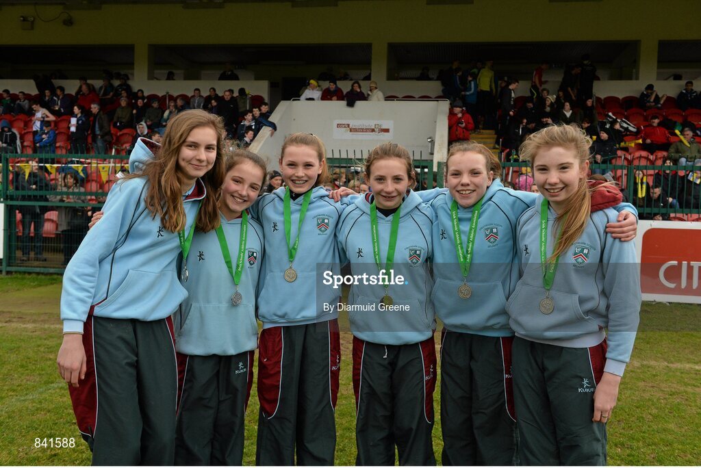 8 March 2014; Strathearn School Belfast students after winning silver in the team event in the Minor Girls 2000m race at the Aviva All-Ireland Schools Cross Country Championships. Cork IT, Bishopstown, Cork. Picture credit: Diarmuid Greene / SPORTSFILE