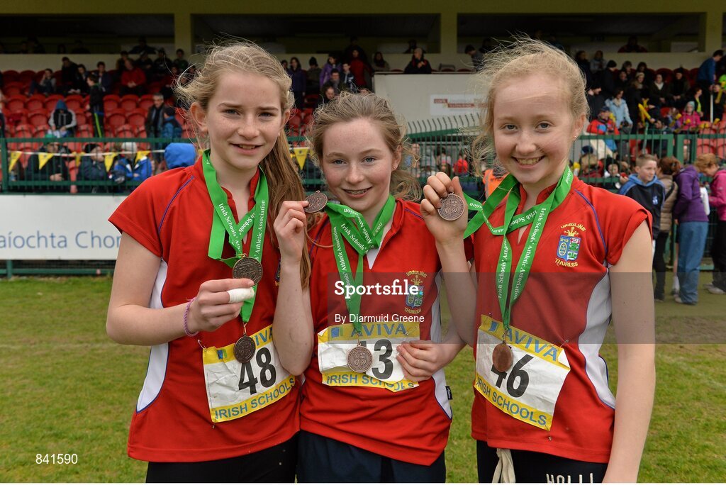 8 March 2014; Ursuline Thurles students, from left to right, Tegan Kelly, Clare Rafter, and Tara Walsh, after winning bronze in the team event in the Minor Girls 2000m race at the Aviva All-Ireland Schools Cross Country Championships. Cork IT, Bishopstown, Cork. Picture credit: Diarmuid Greene / SPORTSFILE
