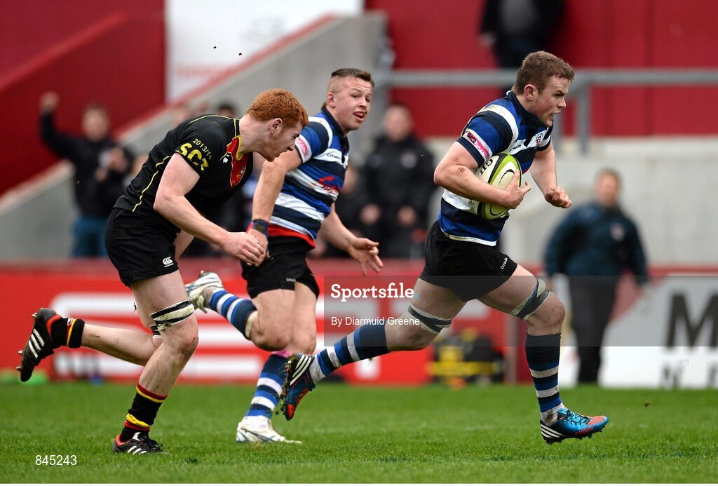 17 March 2014; Cormac Blake, Crescent College, gets away from Patrick Staff, Ard Scoil Ris, on his way to scoring his side's first try. SEAT Munster Schools Senior Cup Final, Ard Scoil Ris v Crescent College, Thomond Park, Limerick. Picture credit: Diarmuid Greene / SPORTSFILE