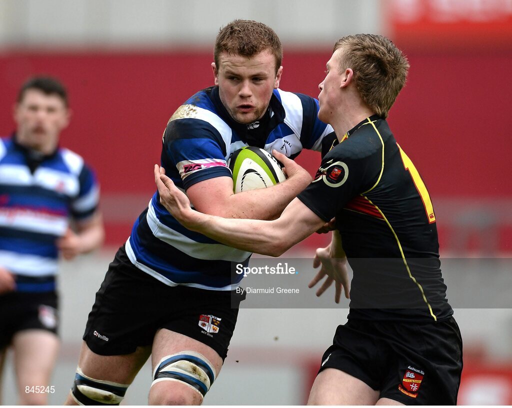 17 March 2014; Cormac Blake, Crescent College, is tackled by Paul McNamara, Ard Scoil Ris. SEAT Munster Schools Senior Cup Final, Ard Scoil Ris v Crescent College, Thomond Park, Limerick. Picture credit: Diarmuid Greene / SPORTSFILE