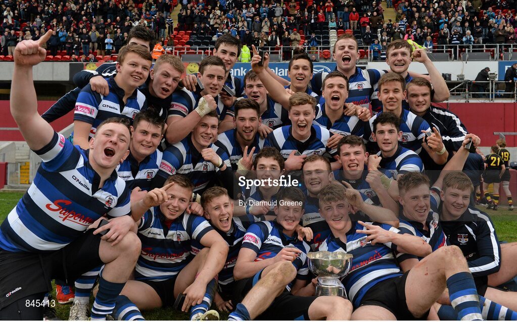 17 March 2014; The Crescent College players celebrate with the cup after defeating Ardscoil Ris. SEAT Munster Schools Senior Cup Final, Ard Scoil Ris v Crescent College Comprehensive, Thomond Park, Limerick. Picture credit: Diarmuid Greene / SPORTSFILE