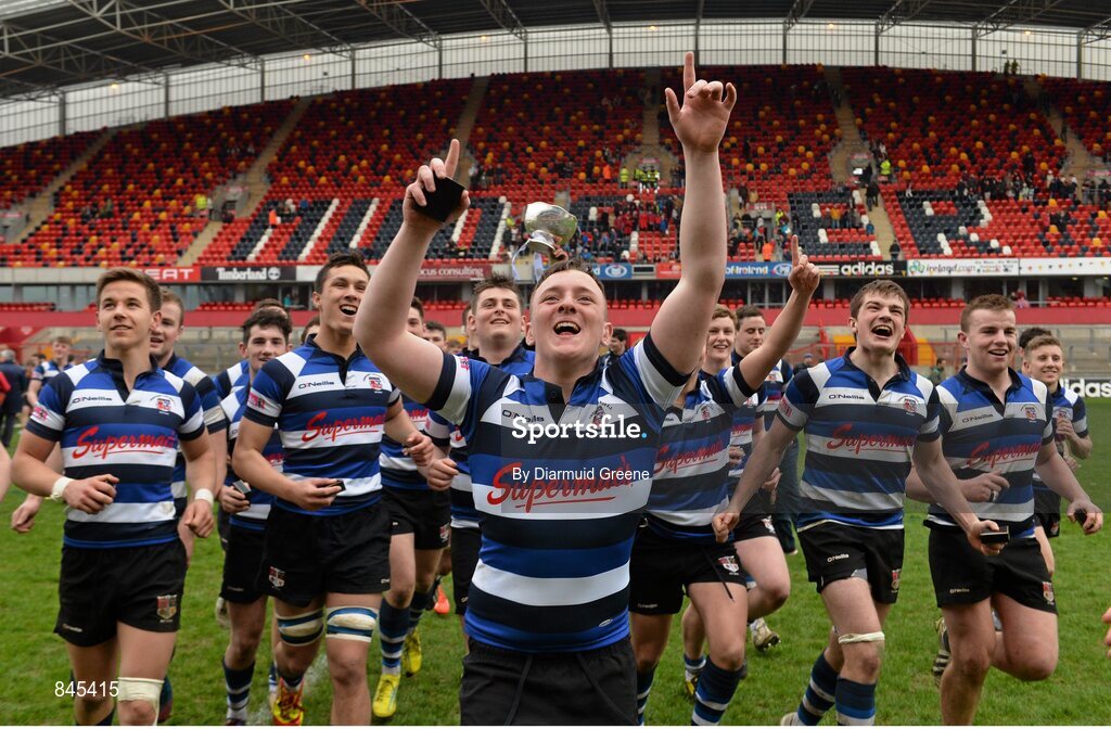 17 March 2014; The Crescent College players celebrate with the cup after defeating Ardscoil Ris. SEAT Munster Schools Senior Cup Final, Ard Scoil Ris v Crescent College Comprehensive, Thomond Park, Limerick. Picture credit: Diarmuid Greene / SPORTSFILE