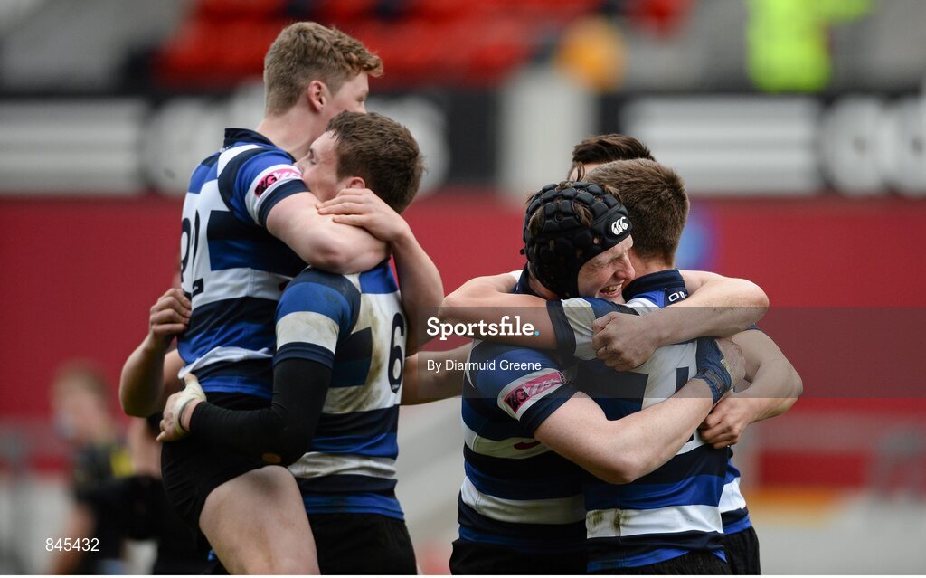 17 March 2014; Crescent College players celebrate at the final whistle after defeating Ardscoil Ris. SEAT Munster Schools Senior Cup Final, Ard Scoil Ris v Crescent College Comprehensive, Thomond Park, Limerick. Picture credit: Diarmuid Greene / SPORTSFILE