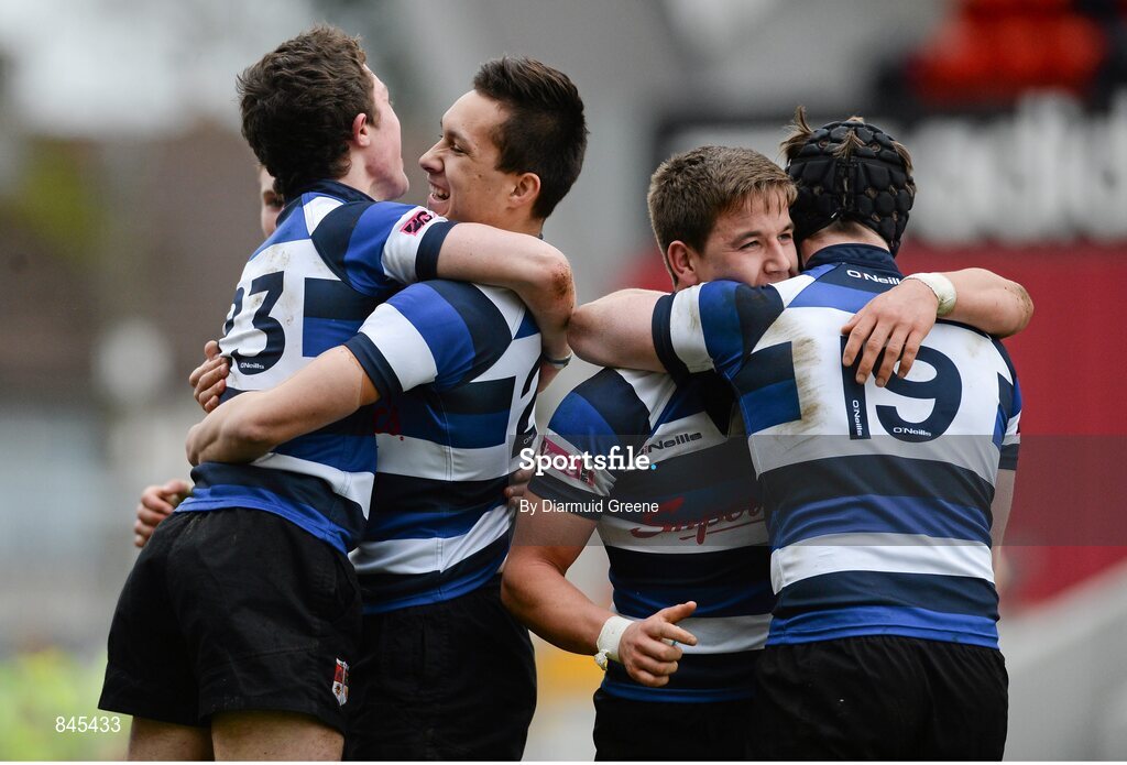 17 March 2014; Crescent College players celebrate at the final whistle after defeating Ardscoil Ris. SEAT Munster Schools Senior Cup Final, Ard Scoil Ris v Crescent College Comprehensive, Thomond Park, Limerick. Picture credit: Diarmuid Greene / SPORTSFILE