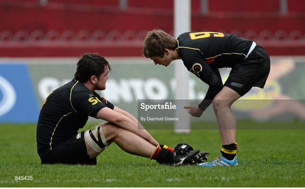 17 March 2014; Darragh Ryan, left, and Diarmuid Scannell Ardscoil Ris, in conversation after defeat to Crescent College. SEAT Munster Schools Senior Cup Final, Ard Scoil Ris v Crescent College Comprehensive, Thomond Park, Limerick. Picture credit: Diarmuid Greene / SPORTSFILE