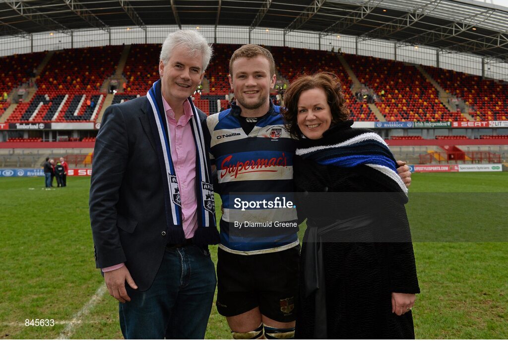 17 March 2014; Crescent College captain Cormac Blake celebrates with his parents John and Noelle after the game. SEAT Munster Schools Senior Cup Final, Ard Scoil Ris v Crescent College Comprehensive, Thomond Park, Limerick. Picture credit: Diarmuid Greene / SPORTSFILE