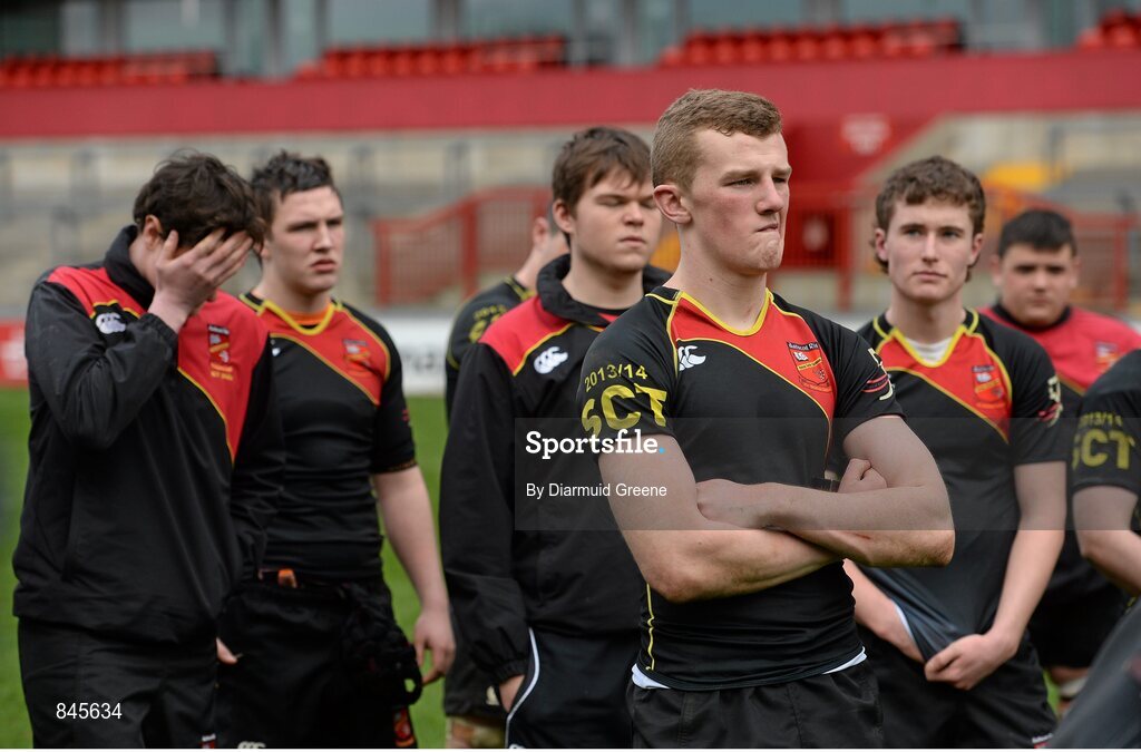 17 March 2014; Ardscoil Ris captain Stephen Fitzgerald and team-mates look on during the cup presentation to Crescent College. SEAT Munster Schools Senior Cup Final, Ard Scoil Ris v Crescent College Comprehensive, Thomond Park, Limerick. Picture credit: Diarmuid Greene / SPORTSFILE