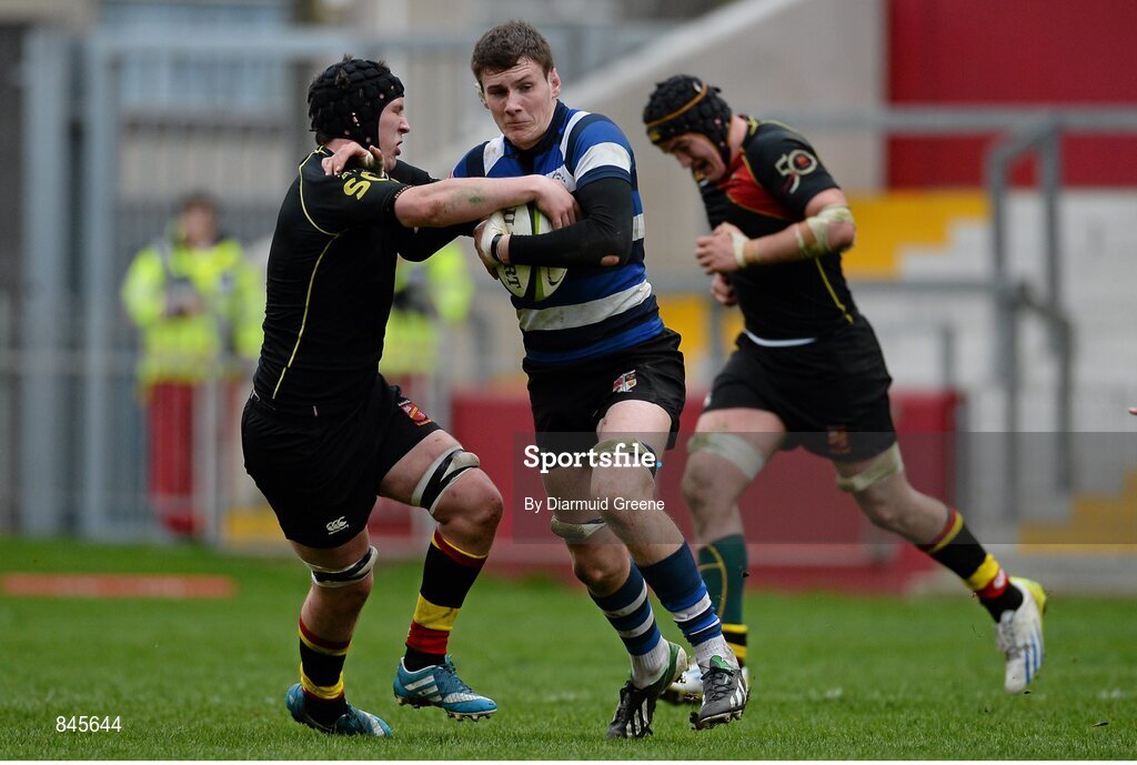 17 March 2014; Sean Fitzgerald, Crescent College, is tackled by Joe Cannon, Ardscoil Ris. SEAT Munster Schools Senior Cup Final, Ard Scoil Ris v Crescent College Comprehensive, Thomond Park, Limerick. Picture credit: Diarmuid Greene / SPORTSFILE