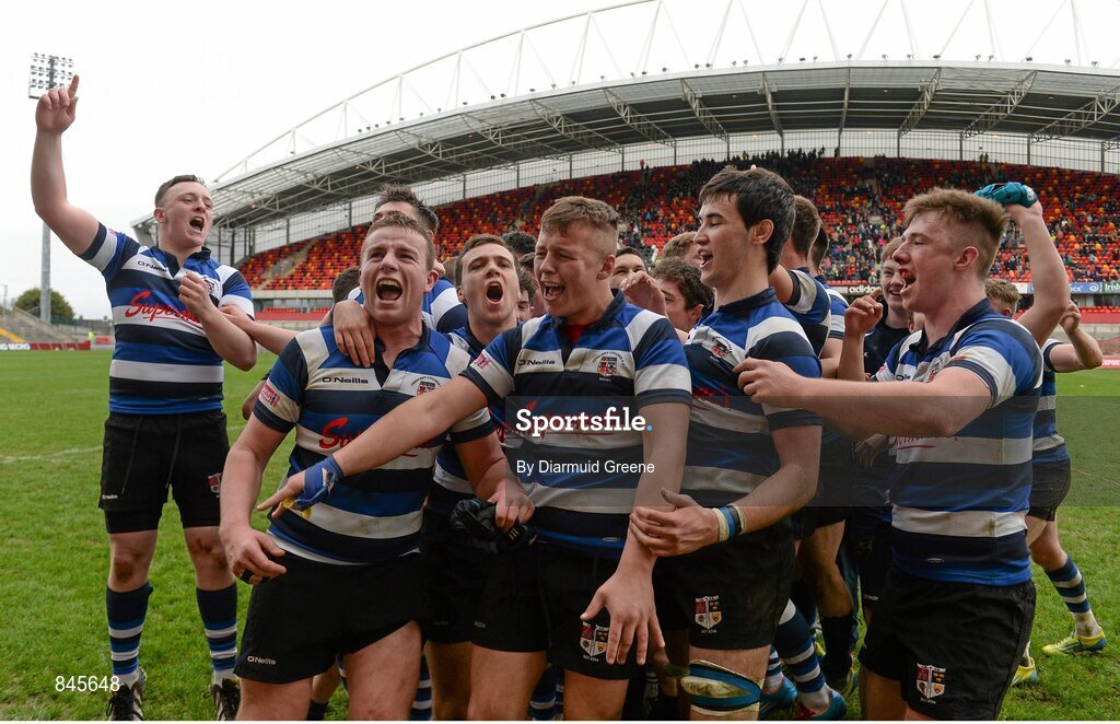 17 March 2014; Crescent College players celebrate after defeating Ardscoil Ris. SEAT Munster Schools Senior Cup Final, Ard Scoil Ris v Crescent College Comprehensive, Thomond Park, Limerick. Picture credit: Diarmuid Greene / SPORTSFILE