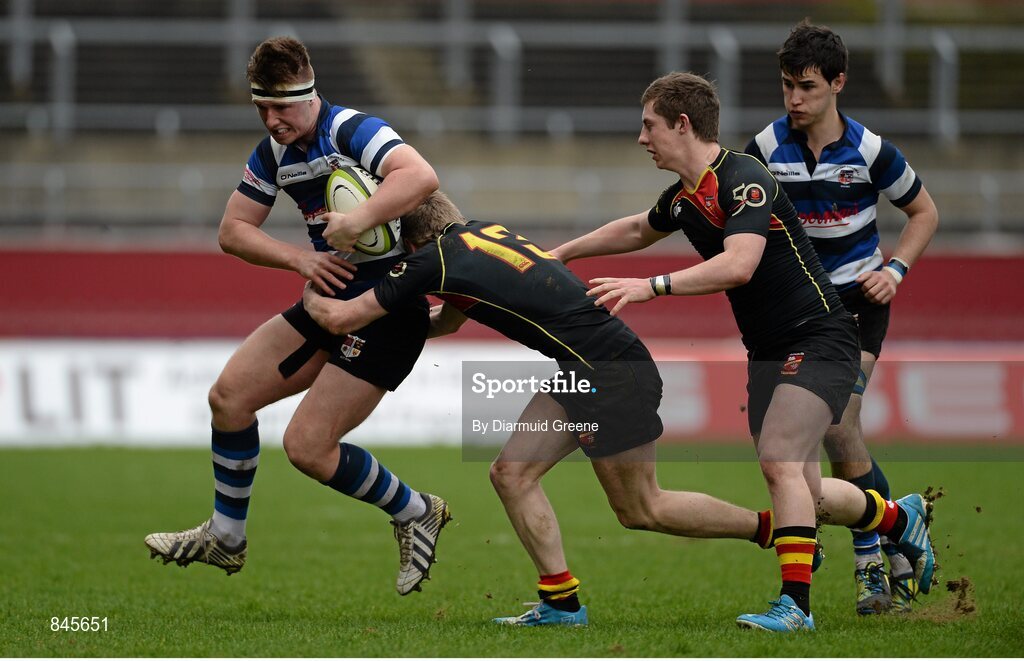 17 March 2014; Mike O'Donnell, Crescent College, is tackled by Paul McNamara, left, and Jack O'Donnell, Ardscoil Ris. SEAT Munster Schools Senior Cup Final, Ard Scoil Ris v Crescent College Comprehensive, Thomond Park, Limerick. Picture credit: Diarmuid Greene / SPORTSFILE