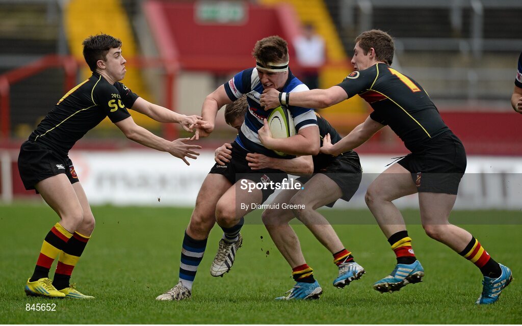 17 March 2014; Mike O'Donnell, Crescent College, is tackled by Liam Brock, left, Paul McNamara and Jack O'Donnell, right, Ardscoil Ris. SEAT Munster Schools Senior Cup Final, Ard Scoil Ris v Crescent College Comprehensive, Thomond Park, Limerick. Picture credit: Diarmuid Greene / SPORTSFILE