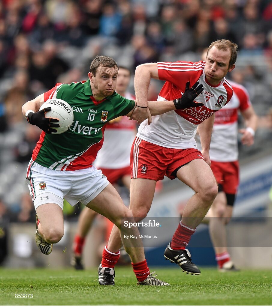 13 April 2014; Keith Higgins, Mayo, in action against Seán Leo McGoldrick, Derry. Allianz Football League Division 1 Semi-Final, Derry v Mayo, Croke Park, Dublin. Picture credit: Ray McManus / SPORTSFILE