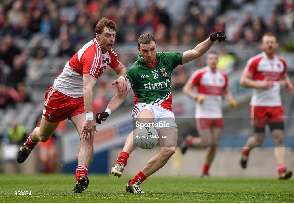 13 April 2014; Keith Higgins scores Mayo's 4th point in the 12th minute under pressure from Gerard O'Kane of Derry. Allianz Football League Division 1 Semi-Final, Derry v Mayo, Croke Park, Dublin. Picture credit: Ray McManus / SPORTSFILE